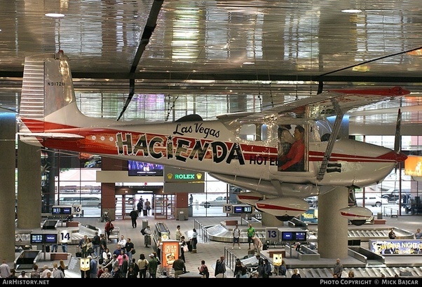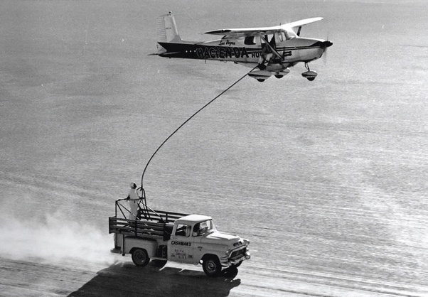 On the afternoon of December 4, 1958, the heavily-modified Cessna 172 took off from what was then called McCarran Field with two pilots. It finally landed on February 7, 1959. The two pilots took turns flying the aircraft. It ranged as far west as Los Angeles and as far south as Yuma but mostly flew long loops over the Mojave south and west of Las Vegas. Twice daily – 128 times in total – it refueled (and took on food/water/oil/filters/etc. via winch) on remote desert roads, as shown here: