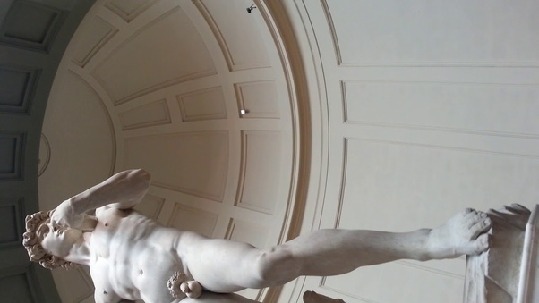 The sculptor knew that you (the viewer) would be on the floor, looking up at David, an awe-inspiring free-standing colossus one could walk around. David the giant-killer is himself 5.17-metre (17 ft 0 in) tall!