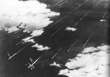 was pretty much lost, trying to find the Japanese fleet. They had reached the point beyond which they wouldn’t have enough fuel to make it back to their own carriers, but their commander decided to keep going, and soon saw a lone Japanese destroyer below. He used its wake as an arrow and followed that direction. It led him directly to the Japanese fleet.