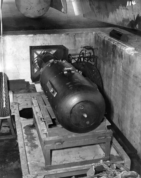 “Little Boy,”(above) at Tinian Island, waiting to be loaded into the bomb bay of the B-29, known as The “Enola Gay.” Pilot Paul Tibbets, waves goodbye as he heads for the, runway on Tinian Island