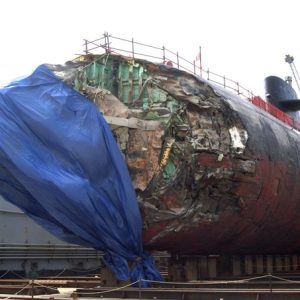 What if a submerged submarine crashed into an aircraft carrier at full speed? What would the damage be like for both vessels? Would the sub survive the impact?